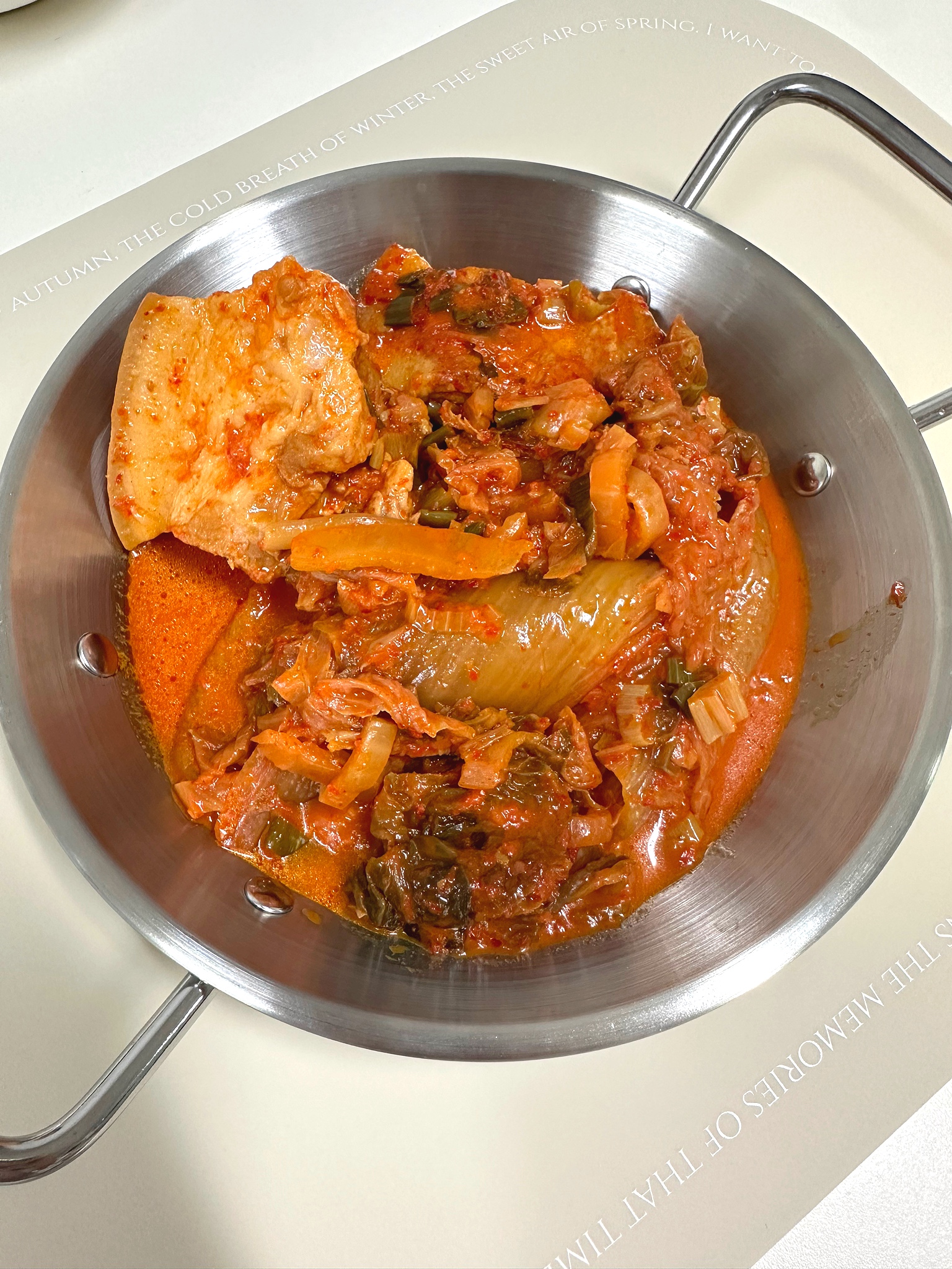물을 더하고 두부나 다른 야채를 추가하면 맛있는 김치찌개가 완성된답니다.