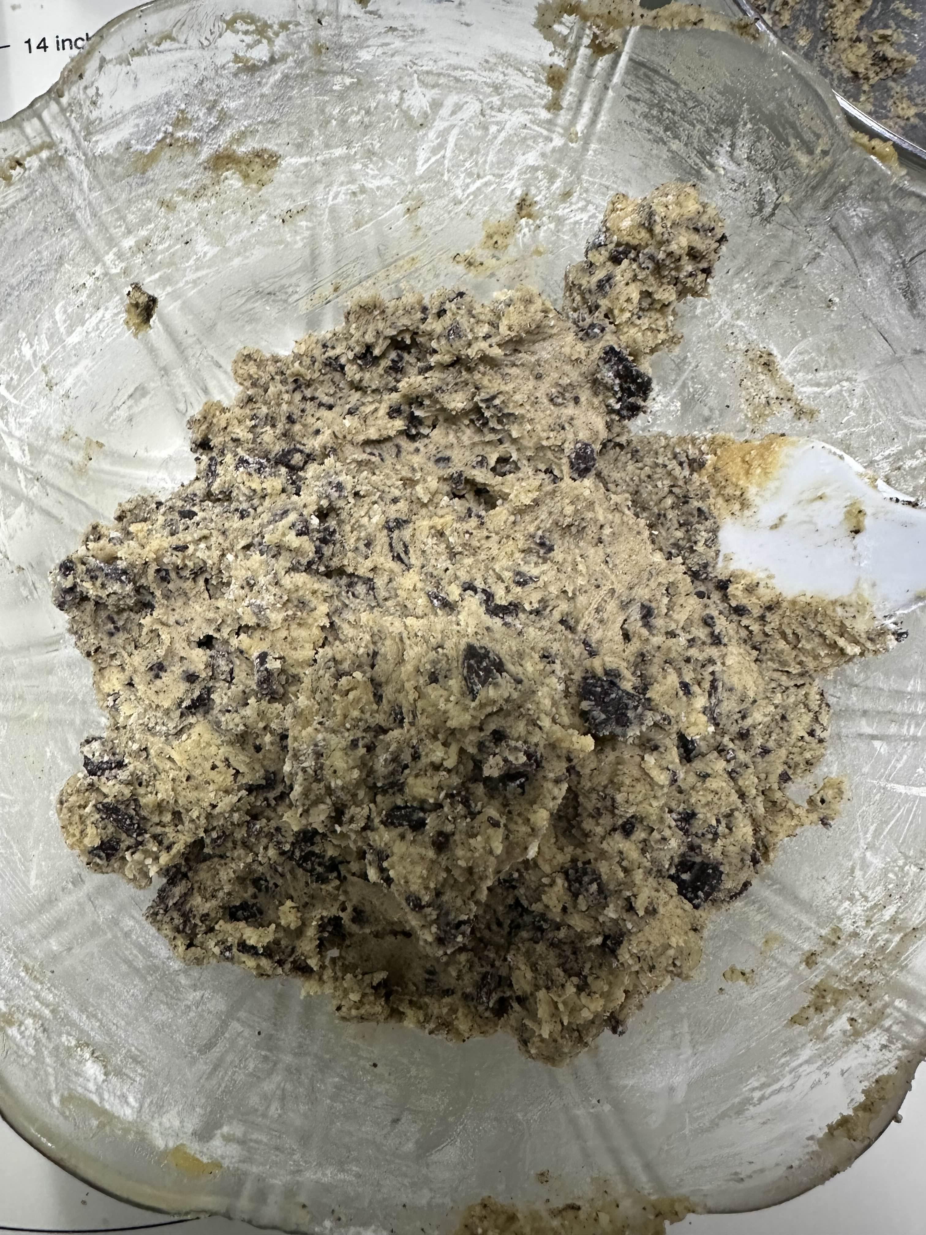 오레오 쿠키를 잘게 부숴 반죽에 넣습니다. 미니 마시멜로도 함께 넣어 섞어줍니다. 이때 마시멜로가 너무 많이 녹지 않도록 주의하면서 천천히 섞는 것이 중요합니다.