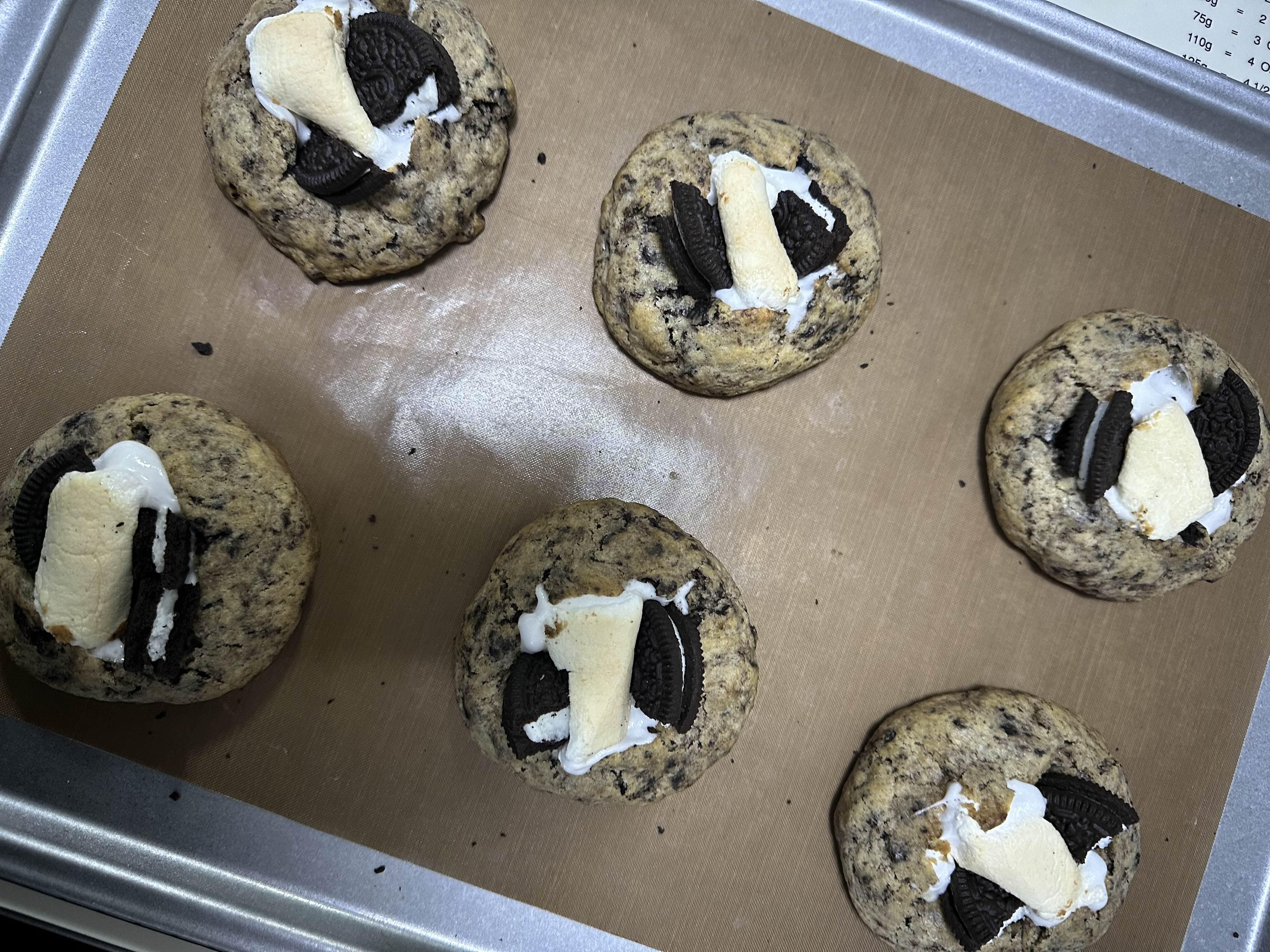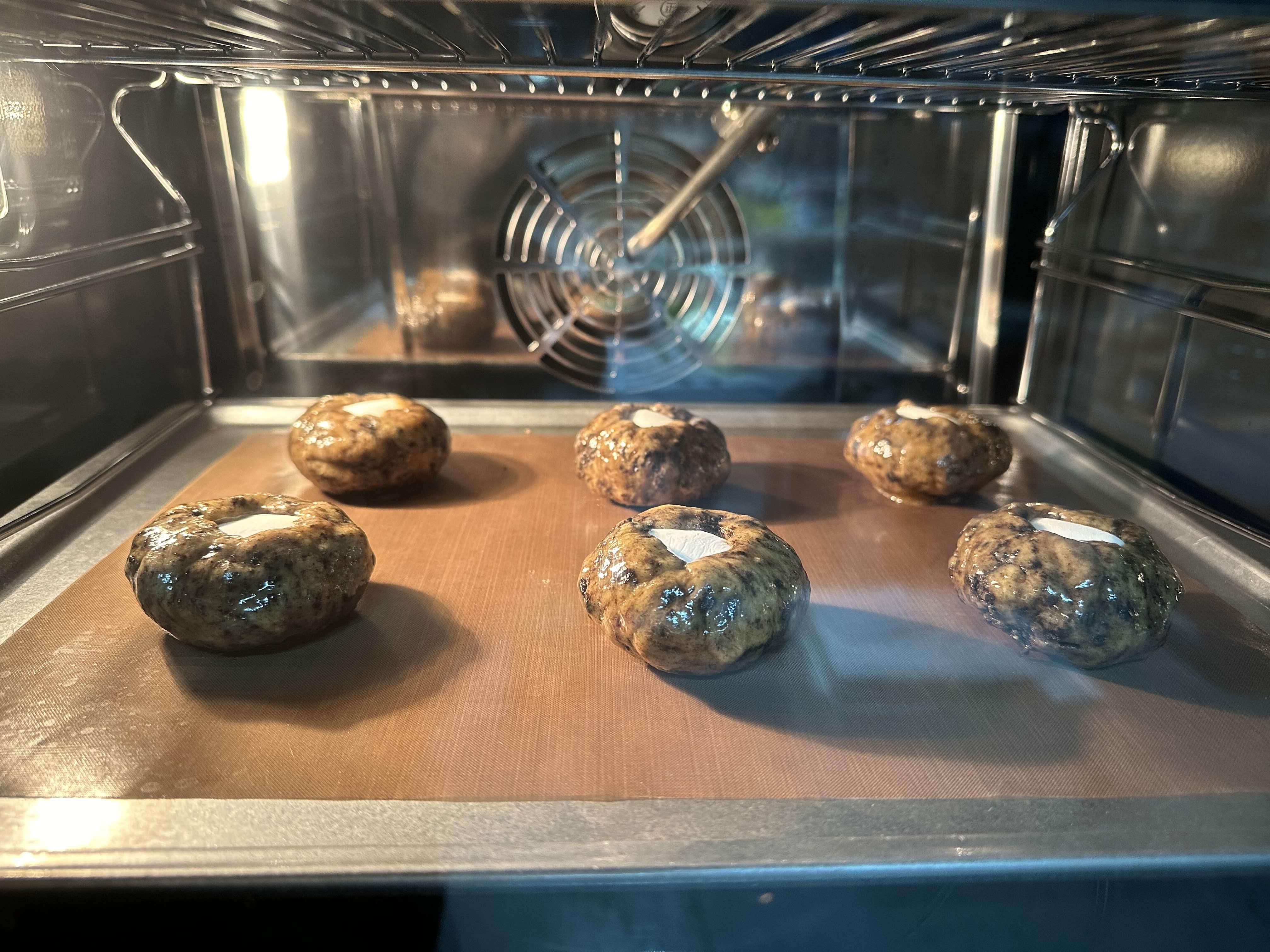 예열한 오븐에 반죽을 넣고 12~15분 정도 구워줍니다. 쿠키가 갈라지면서 마시멜로가 살짝 녹아 예쁜 모양이 만들어집니다. 구워지는 시간을 지켜보면서 쿠키의 겉은 바삭하고 속은 촉촉한 상태를 유지하도록 조절해 주세요.