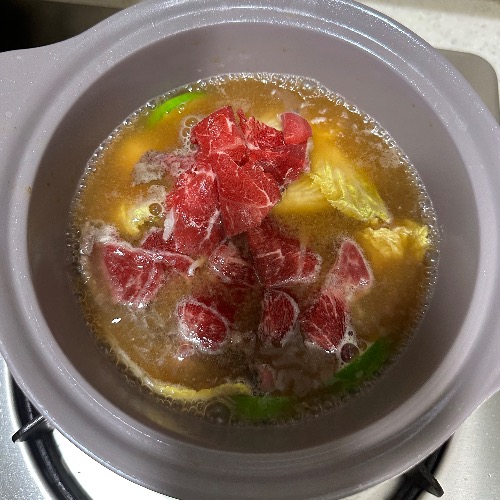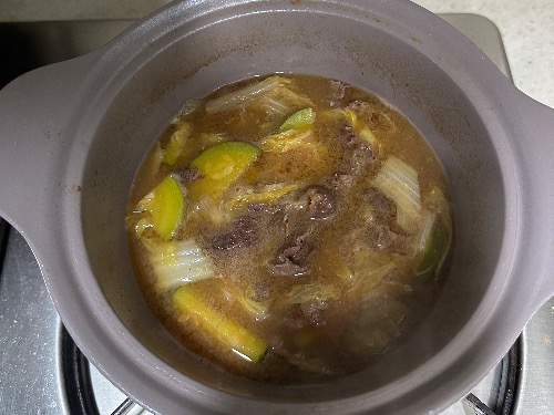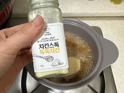 냄비에 물 1L를 붓고 치킨스톡 1큰술을 넣어 녹입니다. 끓이면서 소고기를 추가해 한소끔 끓입니다. 치킨스톡은 육수를 끓일 필요 없이 감칠맛과 깊은 맛을 더해줍니다.