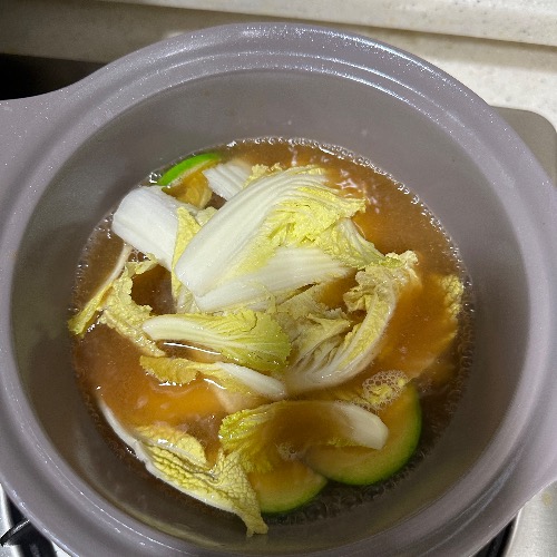 중불로 10분 정도 끓여 배추가 부드럽게 익도록 조리합니다. 대파와 청양고추를 넣고 마지막으로 2~3분 더 끓입니다.
