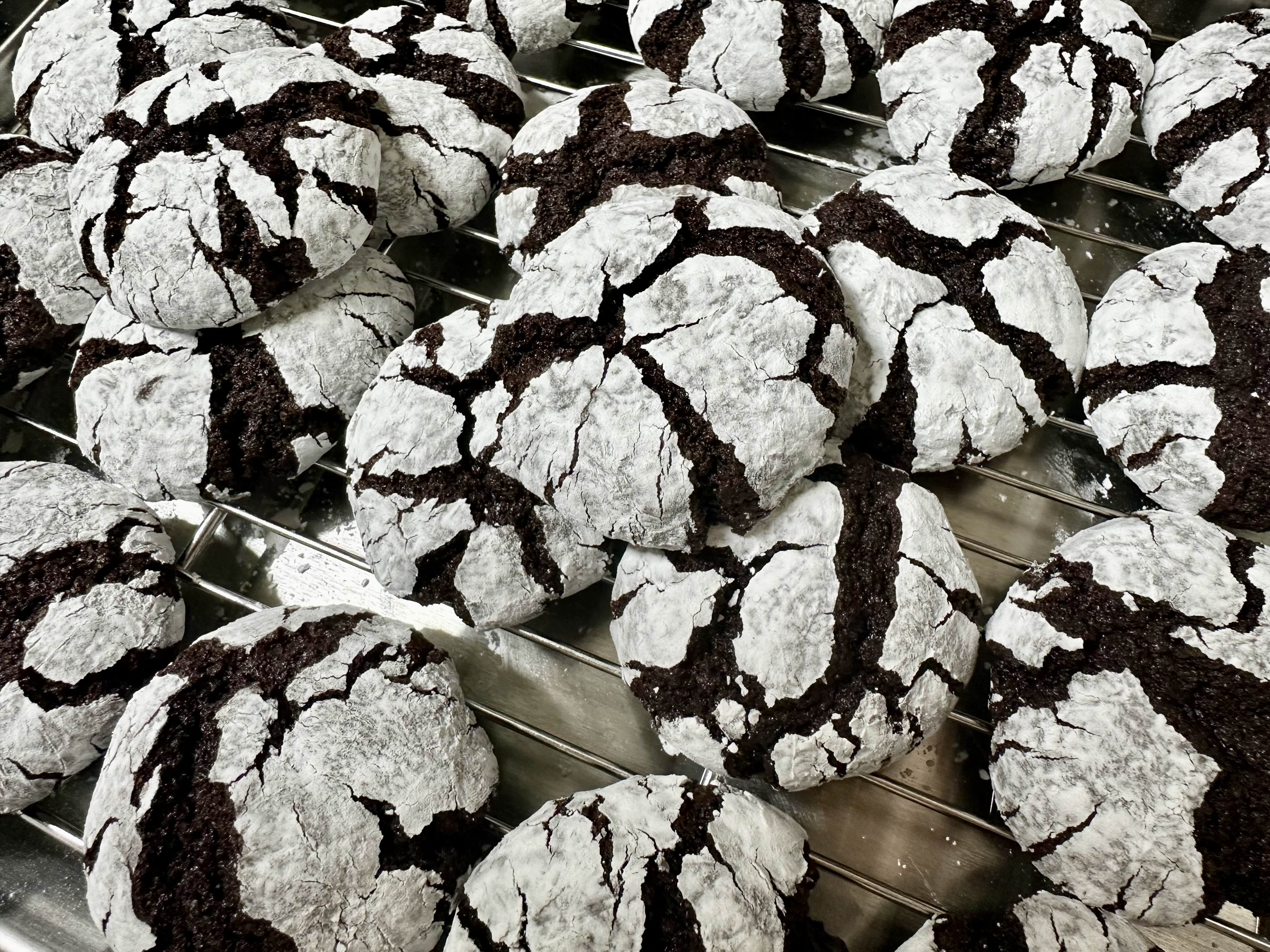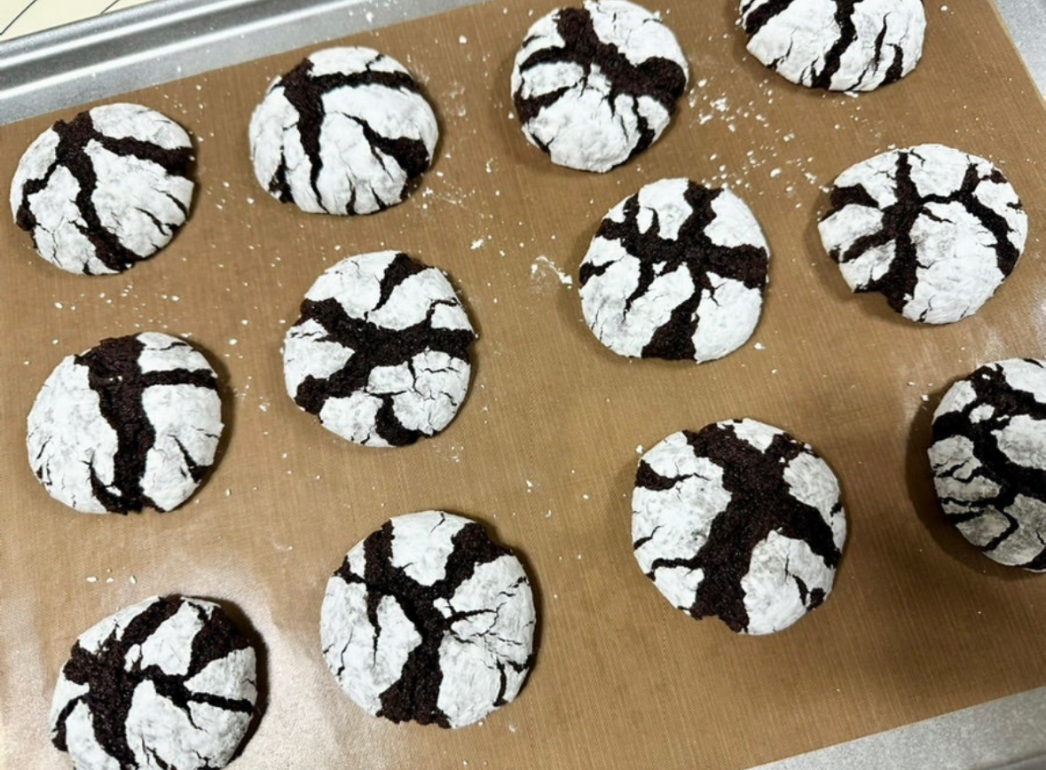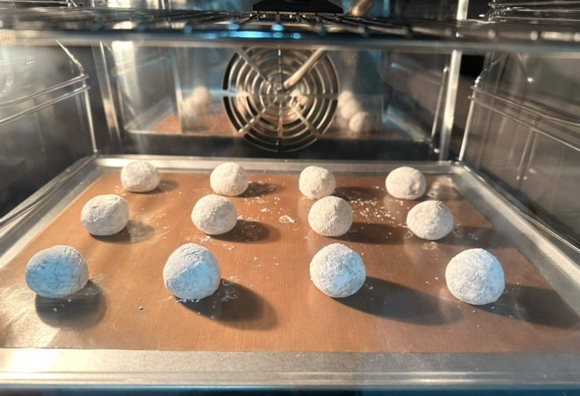 만들어둔 반죽 공을 슈가파우더에 굴려 겉면에 흰색 가루가 충분히 묻게 합니다. 이 슈가파우더가 나중에 크링클 쿠키 특유의 갈라진 모양을 만들어 줍니다. - 굽기