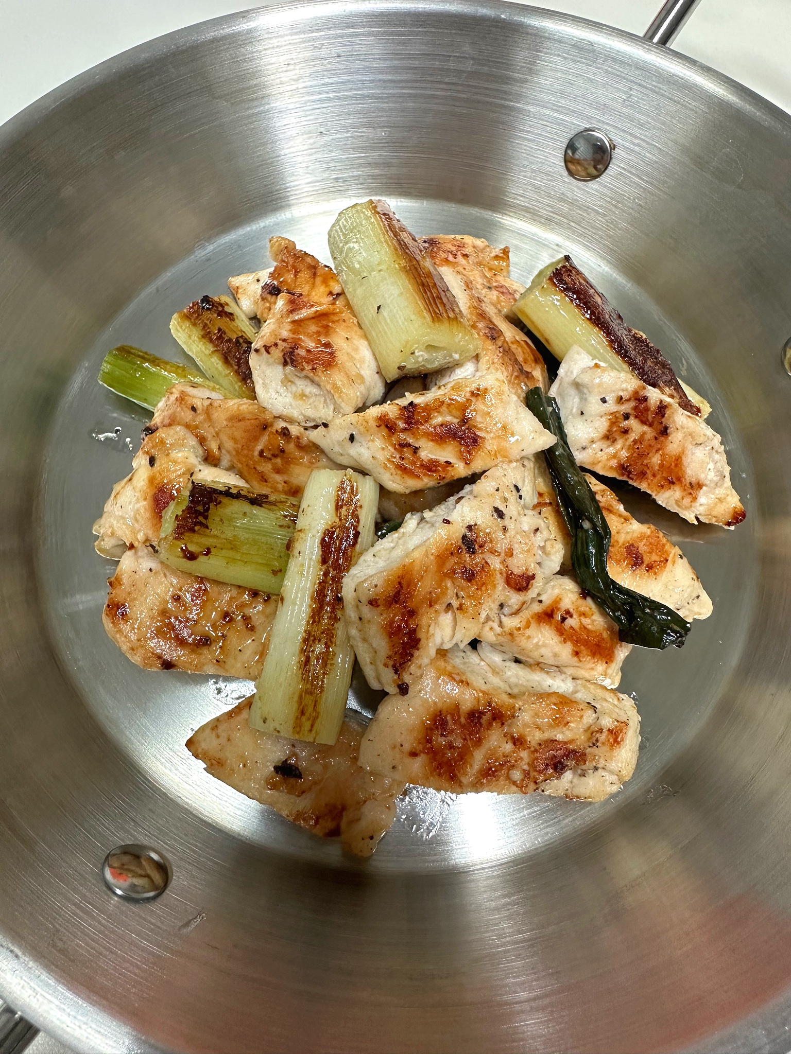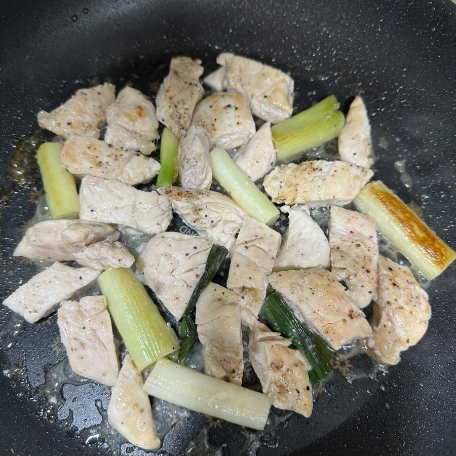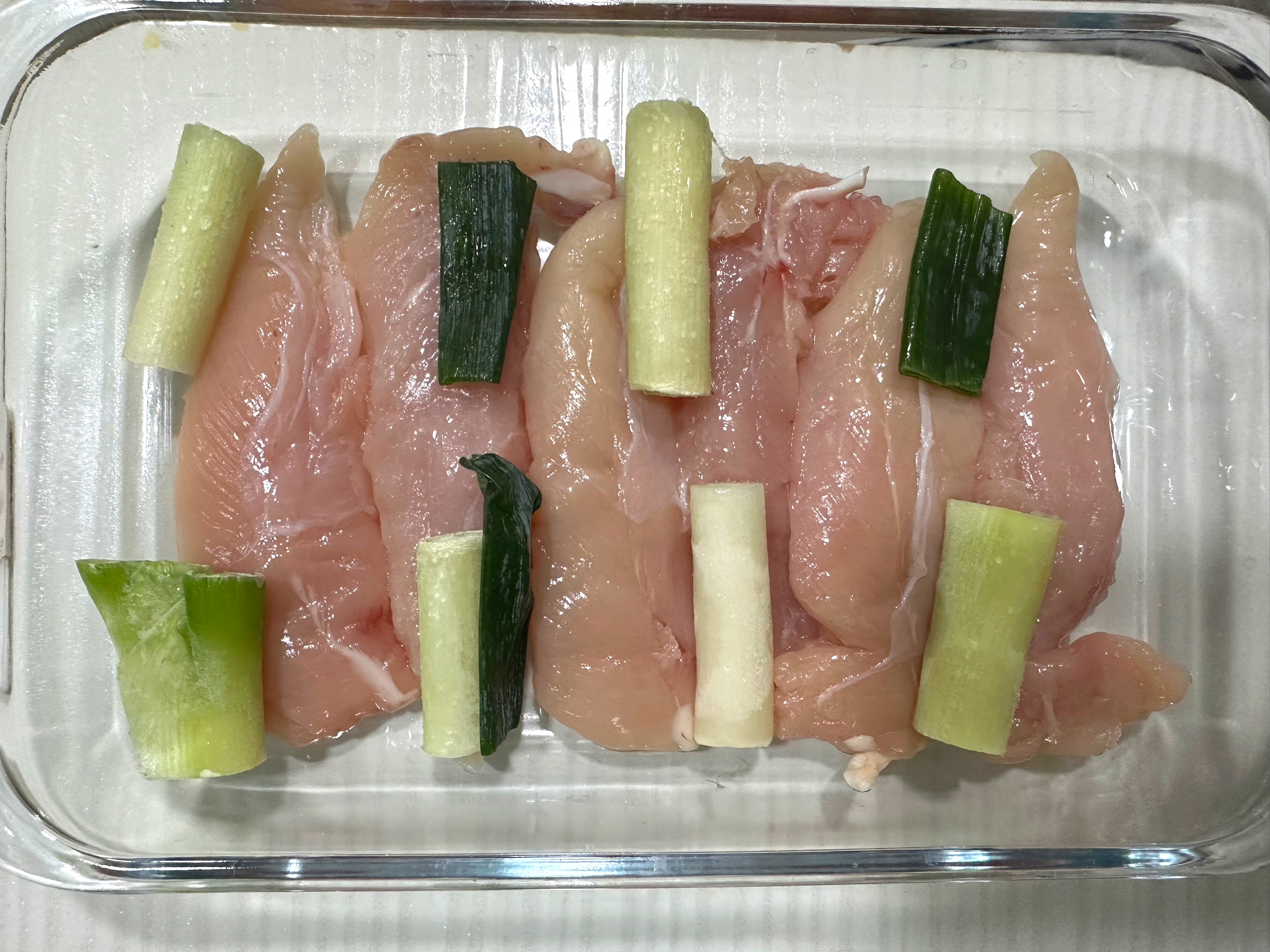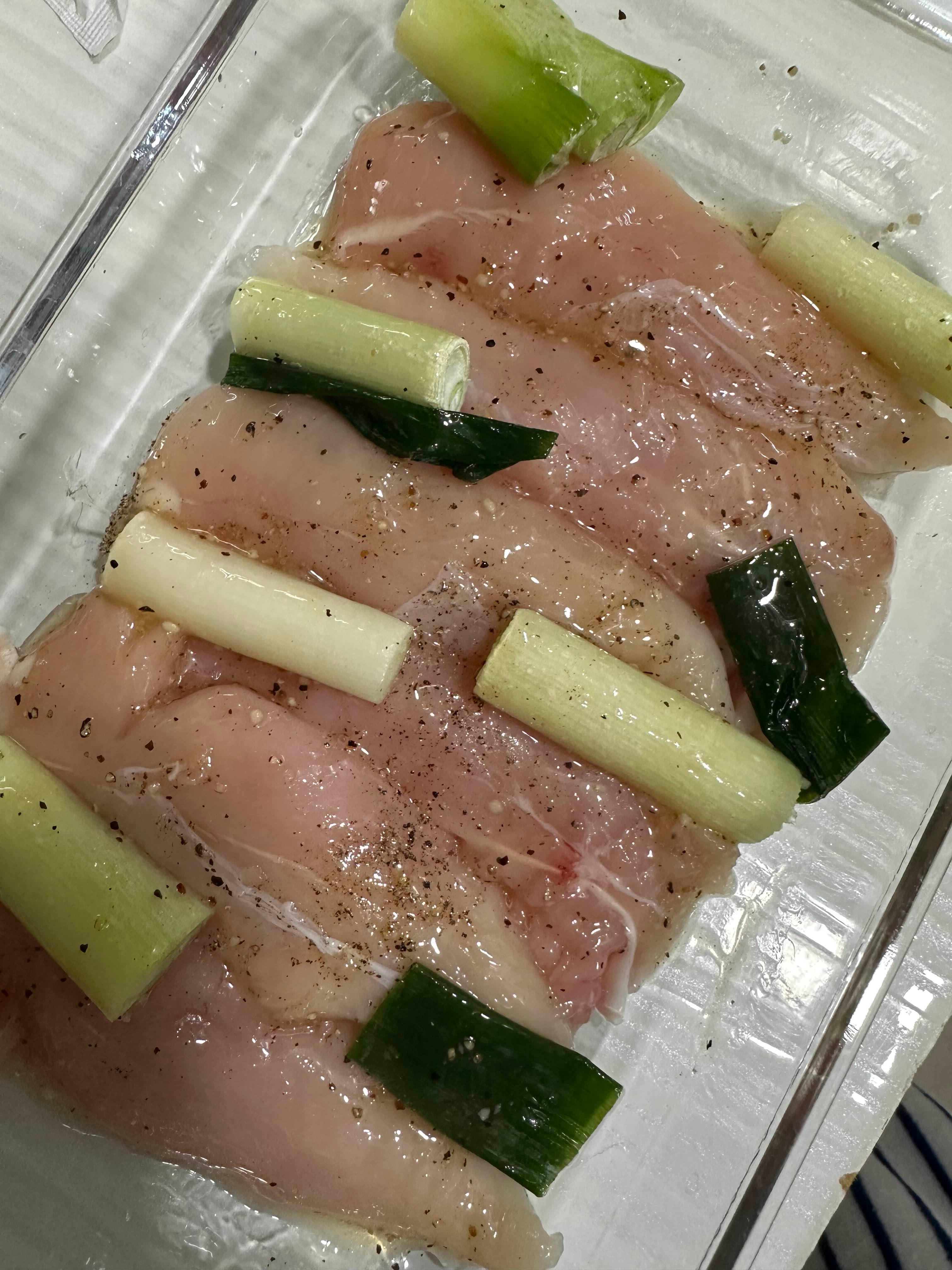 3. 닭정육과 대파에 시오다래 소스를 얇게 골고루 발라줍니다.